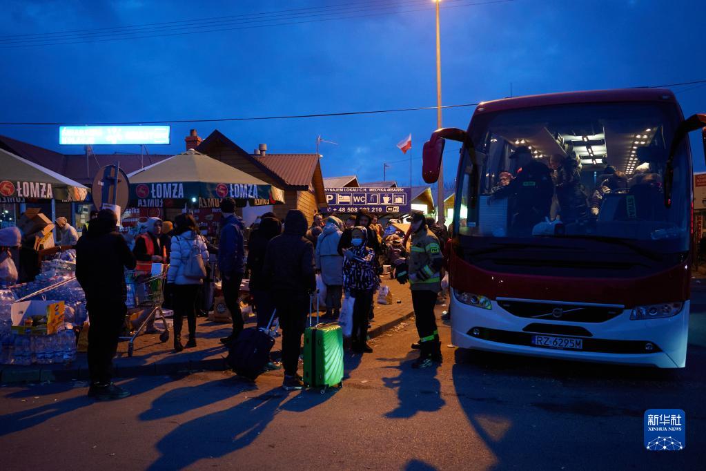 2月26日,在波兰边境关口梅迪卡,乌克兰人登上大巴车。 联合国官员26日说,已有超过12万名乌克兰人前往邻国避难。 新华社记者 孟鼎博 摄