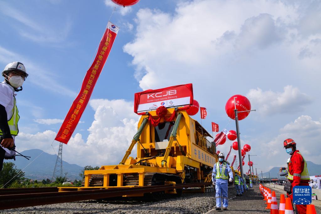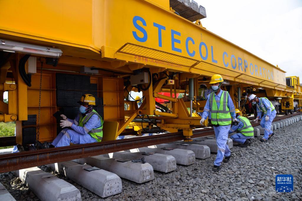 4月20日,工作人员在印度尼西亚万隆雅万高铁铺轨施工现场作业。 20日,随着第一根500米长轨在印度尼西亚西爪哇省万隆县雅万高铁动车走行线顺利铺设,雅万高铁开始启动铺轨施工。雅万高铁是“一带一路”建设和中印尼两国务实合作的标志性项目。 新华社记者 徐钦 摄 |