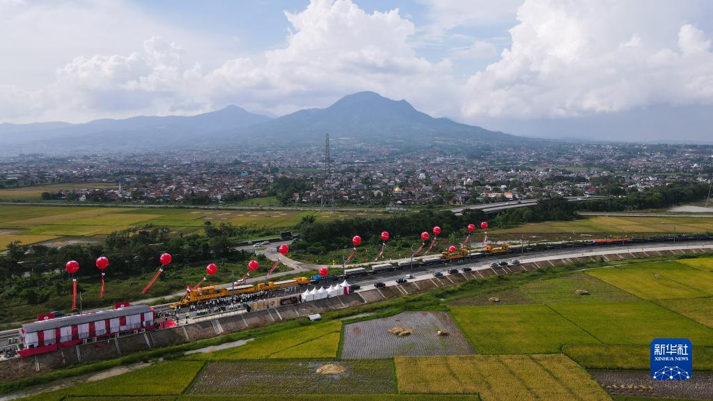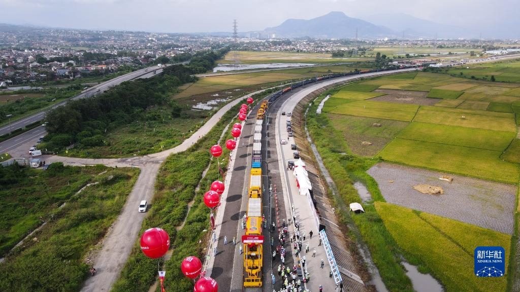 这是4月20日在印度尼西亚万隆拍摄的雅万高铁铺轨施工现场(无人机照片)。 20日,随着第一根500米长轨在印度尼西亚西爪哇省万隆县雅万高铁动车走行线顺利铺设,雅万高铁开始启动铺轨施工。雅万高铁是“一带一路”建设和中印尼两国务实合作的标志性项目。 新华社记者 徐钦 摄