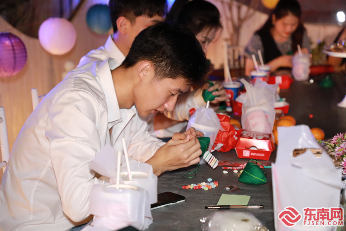 包“星粽”环节(厦门理工学院供图) 来到本次诗会最令人兴奋的包“星粽”和古诗词比赛环节。来宾们将现场具有不同颜色意义的星星(如红色代表祝福,蓝色代表宽容,粉色代表关怀、绿色代表希望等)包进粽子里,再将这份寄寓着希冀与祝福的粽子赠送他人,实现幸福的传递。而五千年文化,三千年诗韵,时下热兴的飞花令“古诗词接龙”,亦让现场观众反响热烈,火花碰撞,体味到“诗词之美,流芳千年”的意蕴。 郭肖华希望可以借助这个端午,让中国流转几千年的优秀传统文化和民间习俗以艺术展示活动的方式呈现给大众,呈现给厦门,留下时代的回响。“我们将在此基础上,联合政产学界,筹划‘沙坡尾天台艺术节’,让天台艺术成为思明区的一张文化名片。”