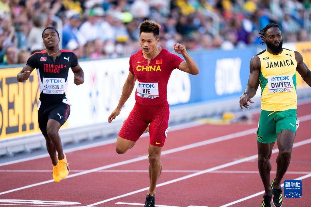 7月18日,谢震业(中)在预赛中冲过终点。新华社记者 王迎 摄