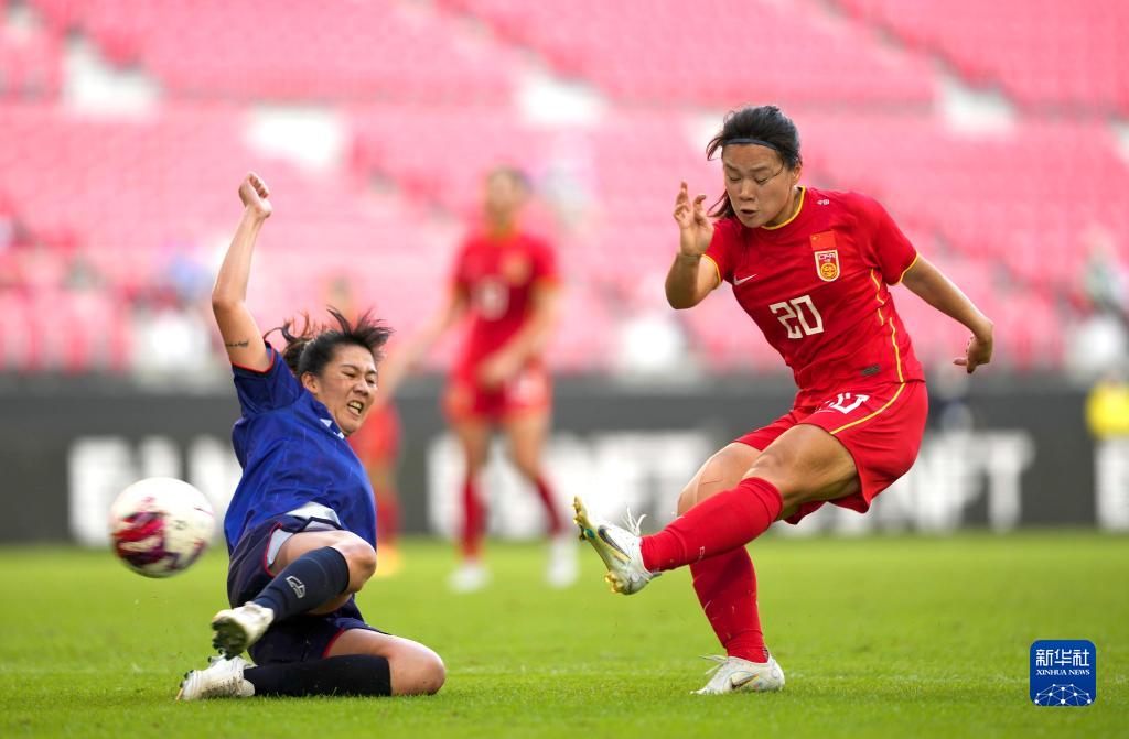 7月20日,中国队球员肖裕仪(右)在比赛中射门。新华社记者 张笑宇 摄