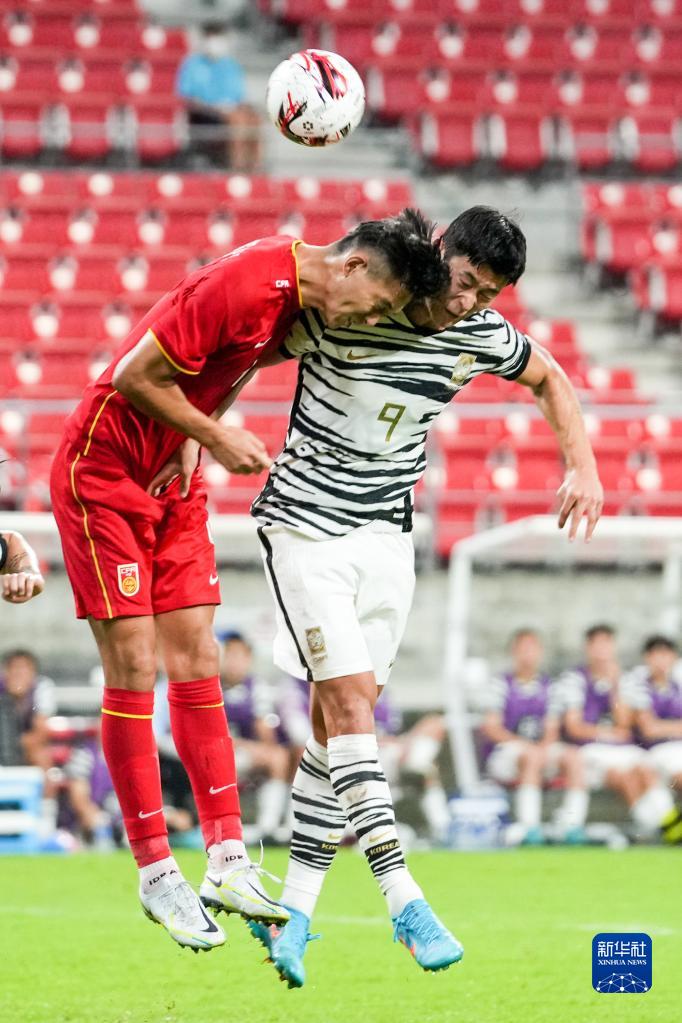 7月20日,中国男足选拔队中国蒋圣龙(左)与韩国队球员曹圭成在比赛中拼抢头球。新华社记者 张笑宇 摄
