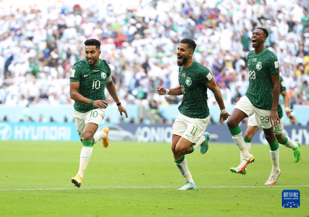 11月22日,沙特阿拉伯队球员萨勒姆-达瓦萨里(左一)在打入球队第二粒进球后庆祝。 当日,在卡塔尔卢赛尔球场进行的2022卡塔尔世界杯足球赛C组比赛中,阿根廷队对阵沙特阿拉伯队。 新华社记者 韩岩 摄 |