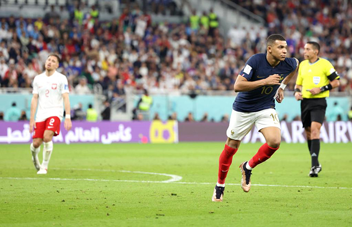 法国队稳操胜券,但姆巴佩的个人表演没有结束,第91分钟他接马库斯·图拉姆的传球再度劲射破门。补时最后时刻,法国队后卫于帕梅卡诺禁区内手球,主裁判观看录像回放后判罚点球,莱万为波兰队挽回颜面。