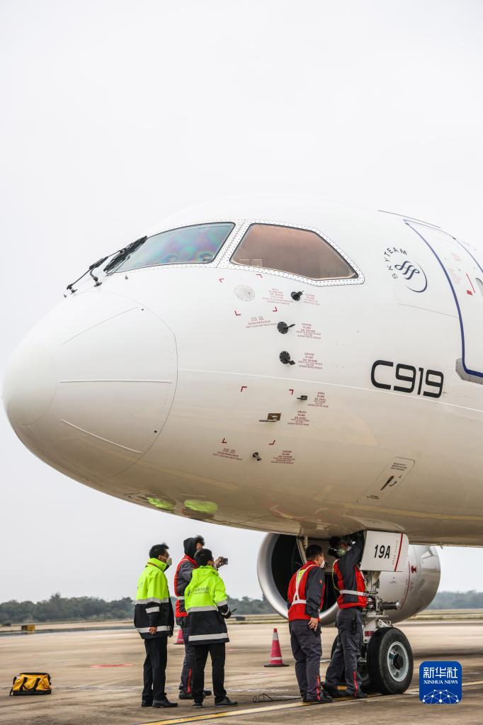 1月2日,海口美兰国际机场的机务人员对国产大飞机C919进行落地检查。