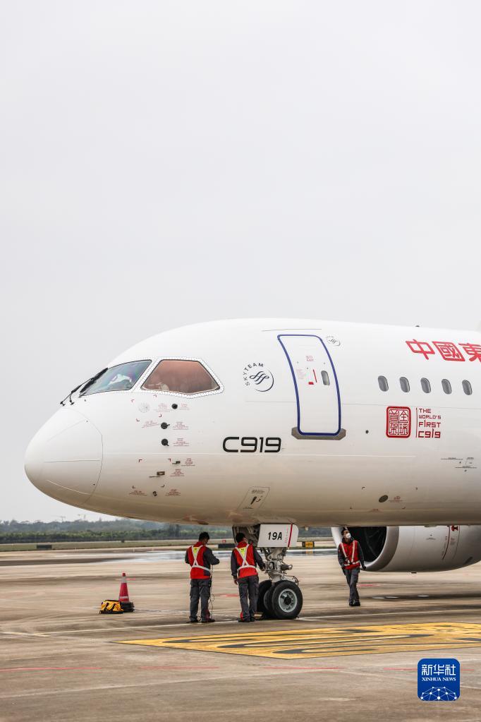 1月2日,海口美兰国际机场的机务人员对国产大飞机C919进行落地检查。