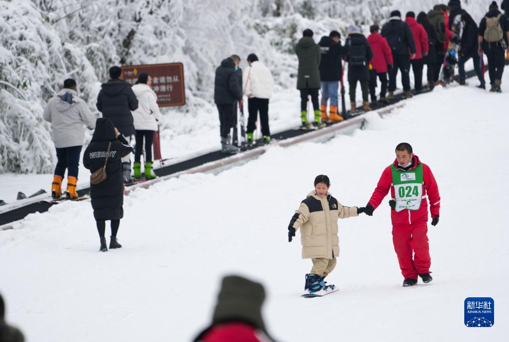 1月1日,在重庆市南川区金佛山景区滑雪场,一名小游客在雪场教练的指导下练习滑雪。