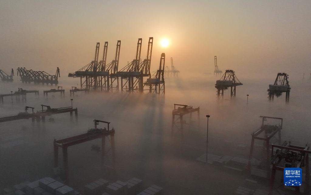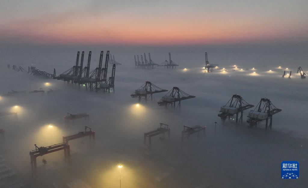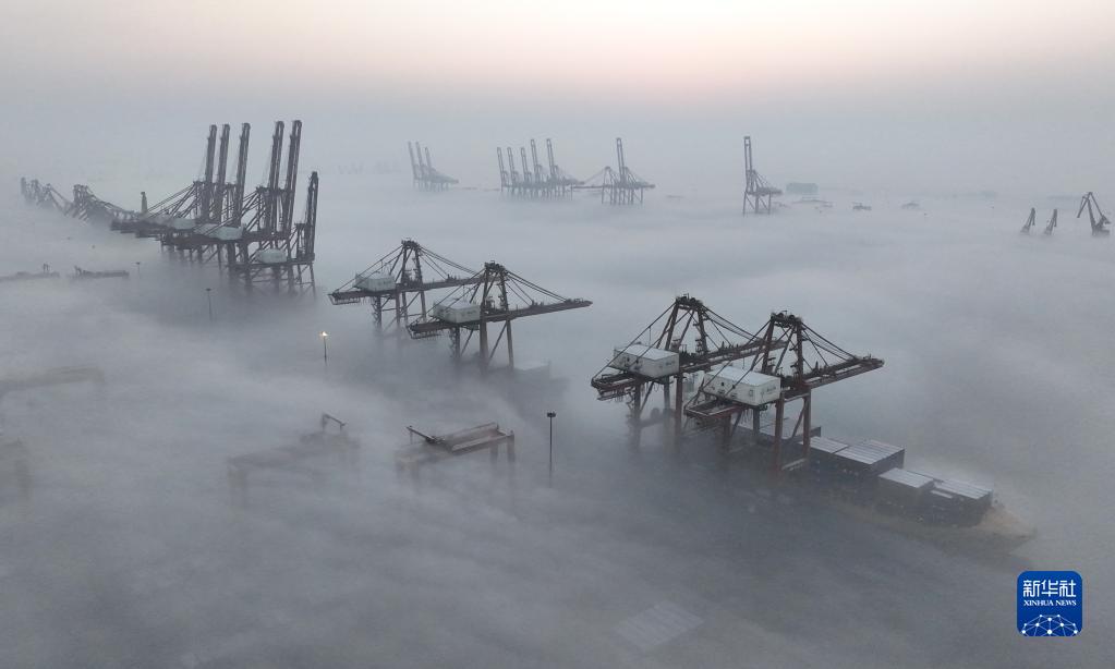 平流雾中的唐山港京唐港区景色(1月5日摄,无人机照片)。 当日,河北省唐山港京唐港区出现平流雾景观。 新华社记者 杨世尧 摄