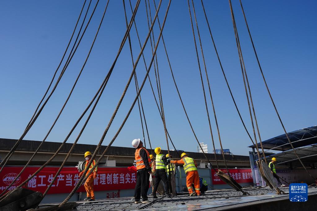 1月7日,施工人员在深江铁路深莞隧道西段出口明挖隧道吊装首幅地连墙钢筋笼。