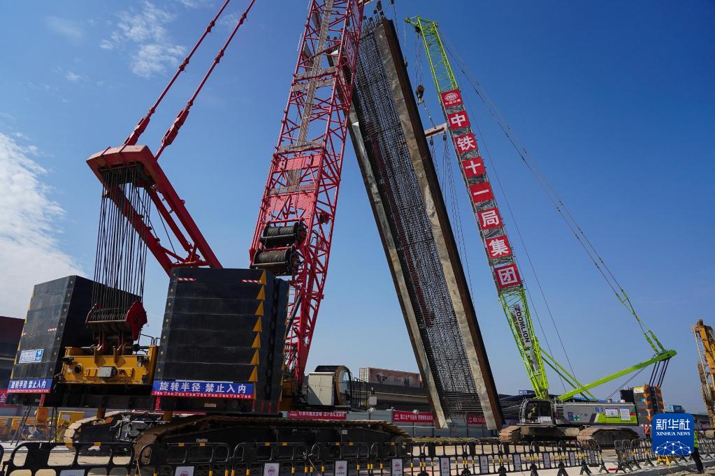 1月7日,在深江铁路深莞隧道西段出口明挖隧道施工现场,两台吊机配合着将首幅地连墙钢筋笼抬吊至垂直位置。