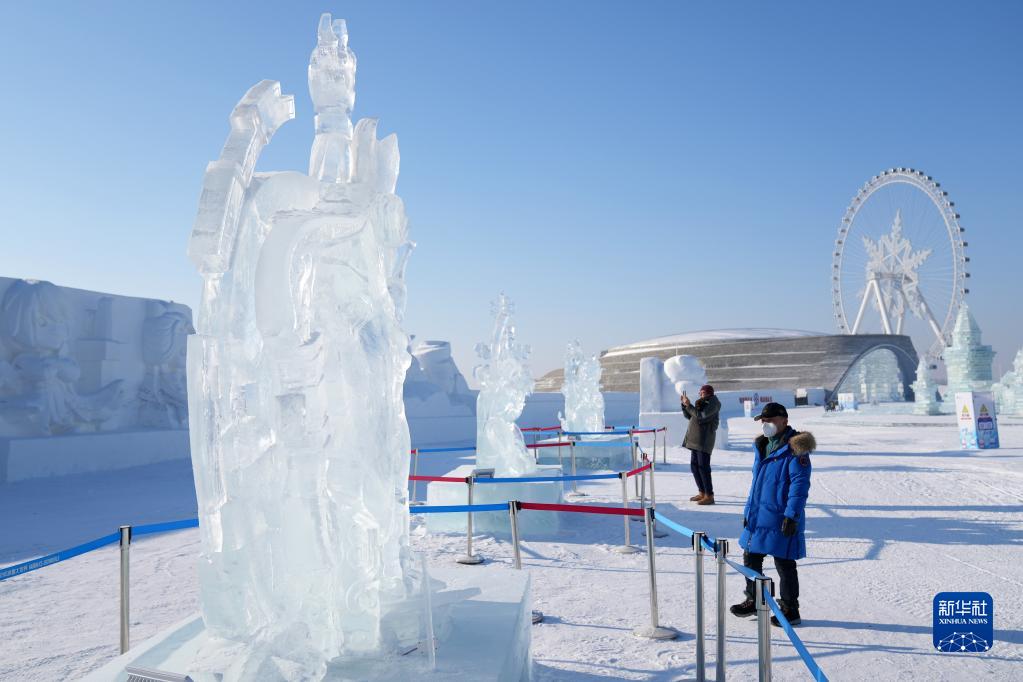 1月5日,在哈尔滨冰雪大世界园区,评委观看参赛冰雕作品。