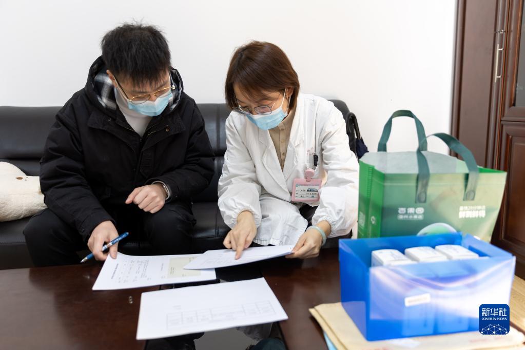 1月8日,在上海市闵行区颛桥社区卫生服务中心,医务科科长王莉芸(右)与护理院工作人员核对新冠小分子药配送清单。新华社记者 王翔 摄