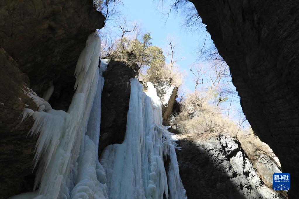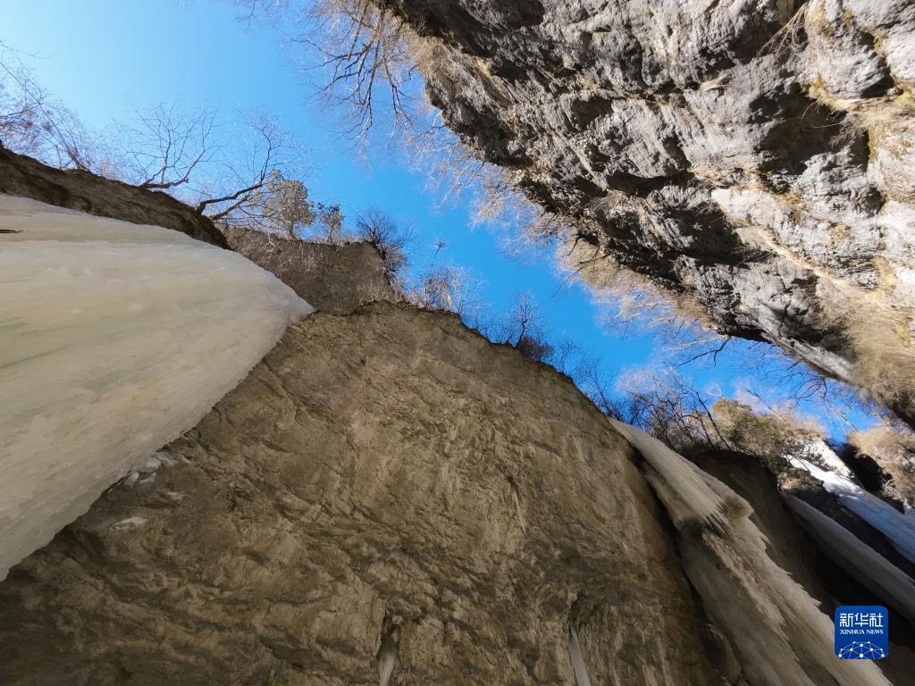 这是1月8日拍摄的官鹅沟景区冰瀑景观。 入冬以来,甘肃省陇南市宕昌县境内官鹅沟景区的冰瀑景观吸引了众多游客。 新华社记者 张智敏 摄