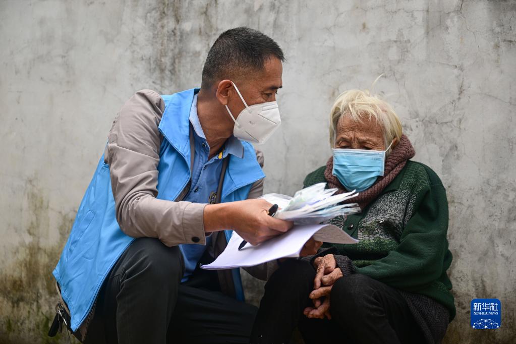 1月7日,在海南省文昌市铺前镇地太村,村干部向高龄老人发放防疫“健康包”,并介绍防疫物品使用方法。