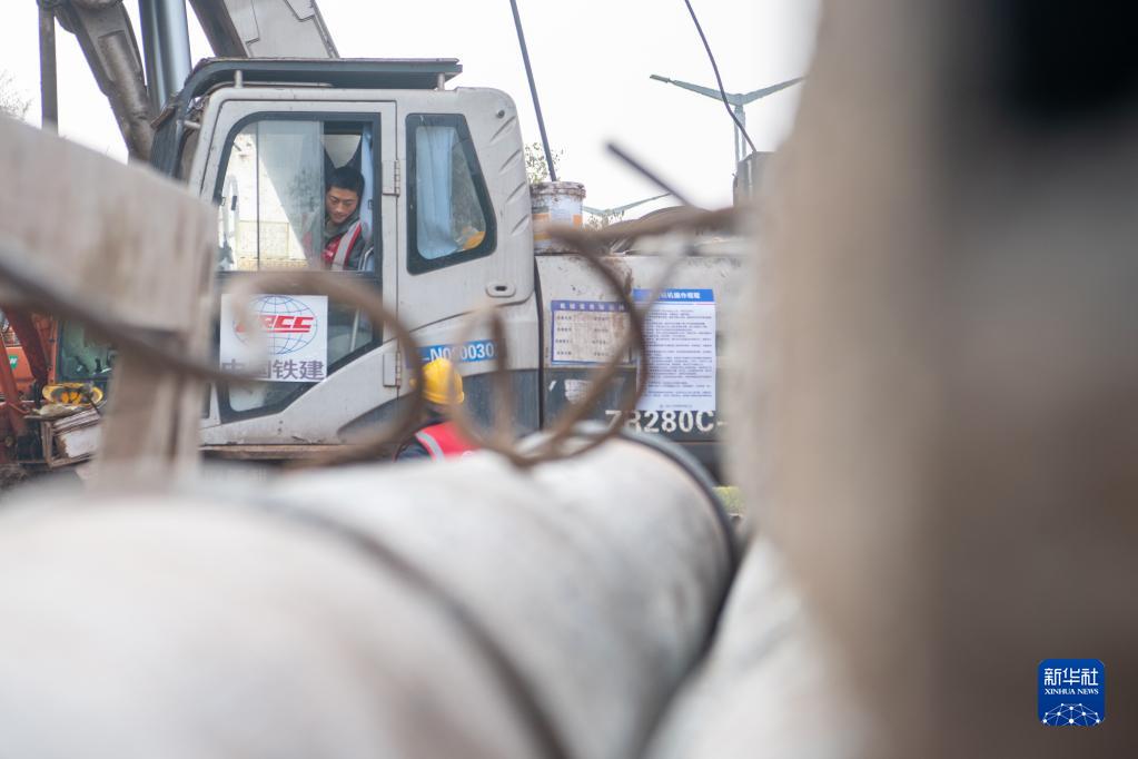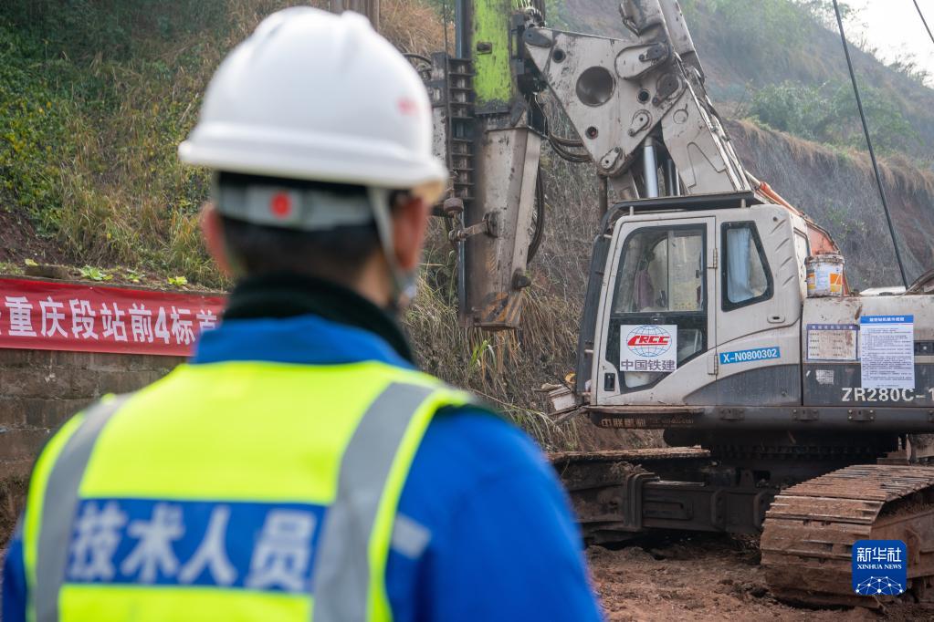 1月8日,工作人员在位于重庆市大足区境内的成渝中线高铁建设施工现场作业。 当日,成渝中线高铁重庆段站前4标首根钻孔桩率先开钻,标志着成渝中线高铁全线主体工程进入实质性开工阶段。 成渝中线高铁正线全长292公里,设计时速350公里,部分区段预留进一步提速条件,建设工期5年。 新华社记者 唐奕 摄