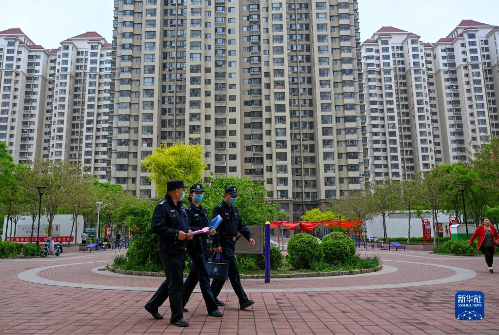 天津市公安局津南分局中铁派出所的社区民警吕诗情(中)与民警王洪心(左)、辅警李兆辉在林景家园内巡逻(2022年4月28日摄)。新华社记者 孙凡越 摄