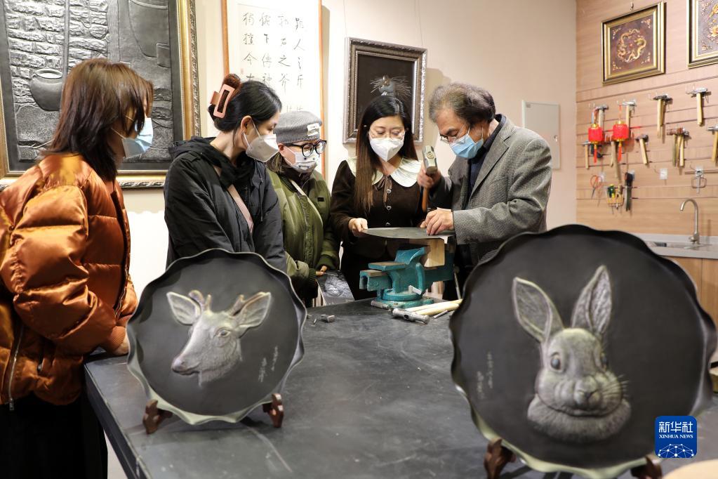 1月9日,在石家庄市湾里庙步行街郭海博民间文艺家工作室,铁板浮雕艺术家郭海博(右一)在向观众介绍铁板浮雕技艺。 河北省石家庄市充分利用文化资源,着力打造群众身边的人文公共空间,以文艺创作、展播、交流等形式,大力开展“家门口”的文化艺术普及、优秀文化传承等活动,不断提升城市文化品位。 石家庄市在街头巷尾、社区周边设立52家涵盖书法、美术、戏曲、写作、音乐等多个门类的工作室,免费向群众开放,让广大市民在茶余饭后就能体验丰富多彩的文化生活。新华社记者 骆学峰 摄