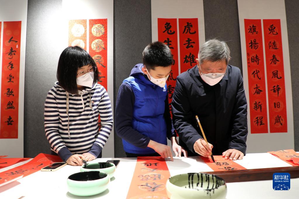 1月9日,在石家庄市刘金凯书法家工作室,书法家刘金凯(右)指导书法小学员写春联。