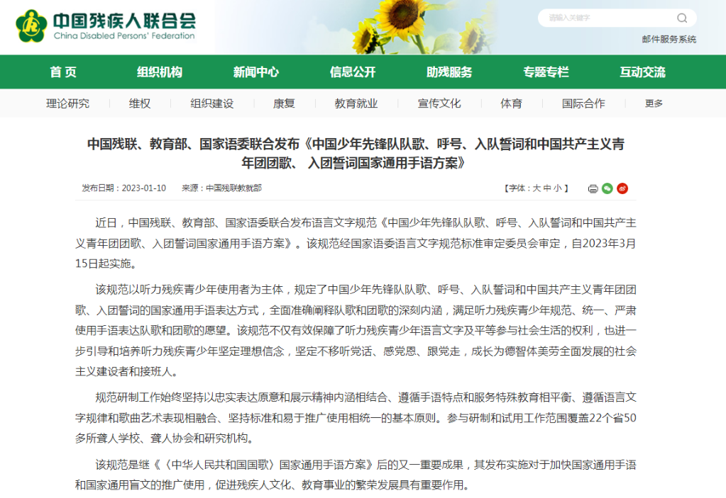 记者10日从中国残联获悉,中国残联、教育部、国家语委日前联合发布语言文字规范《中国少年先锋队队歌、呼号、入队誓词和中国共产主义青年团团歌、入团誓词国家通用手语方案》。该规范将自2023年3月15日起实施。