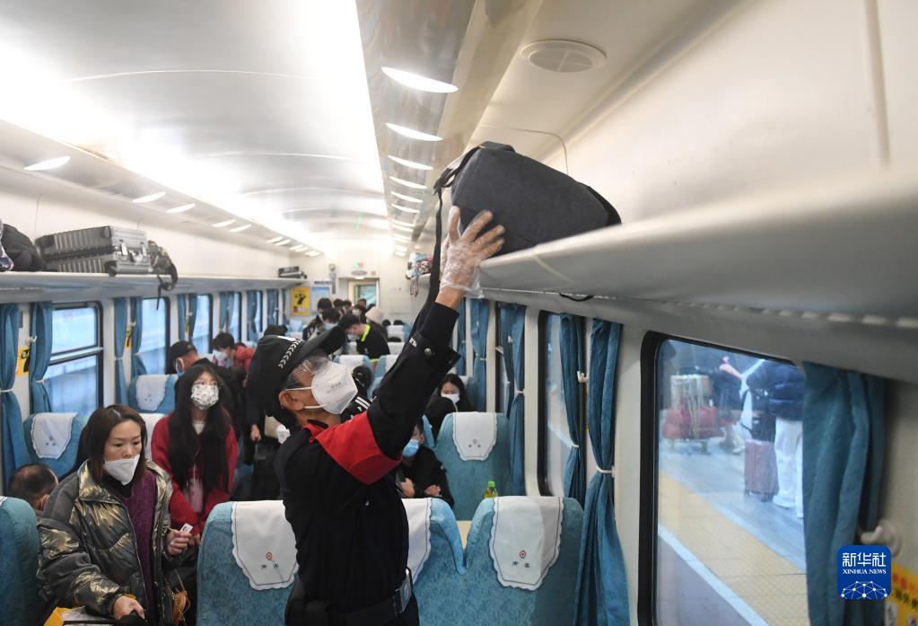 1月10日,覃业民帮旅客将行李放到行李架上。