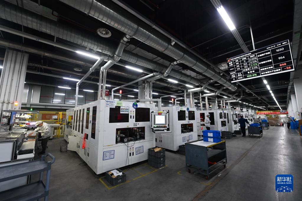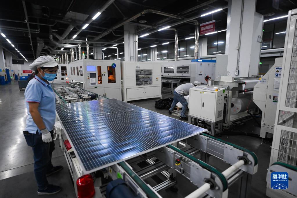 1月10日,在位于嘉兴秀洲光伏小镇内的一家科技有限公司,自动化流水线在生产光伏设备组件。 近年来,浙江省嘉兴市秀洲区积极发展光伏新能源产业,打造了涵盖“电池片+光伏玻璃+配套产品+组件+储能+智能制造”的光伏全产业链,同时还将光伏元素融入日常的光伏屋顶、健身步道、路灯、公交站台、停车场等基础设施中。2022年,嘉兴市秀洲区光伏新能源产业同比增长73.7%,成为经济增长新亮点。 新华社记者 徐昱 摄
