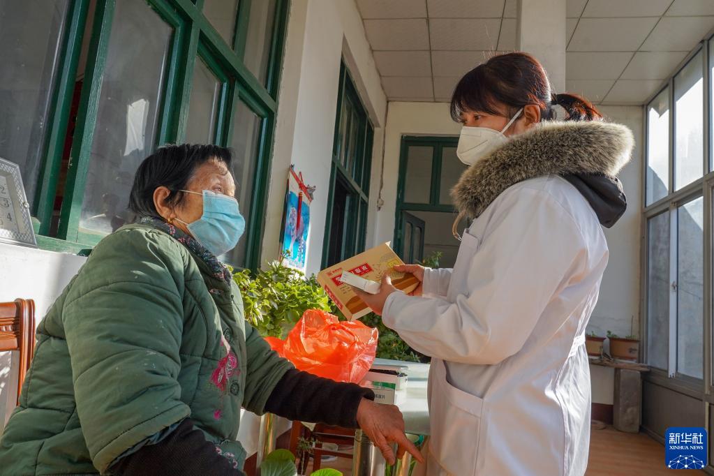 1月10日,山东省济南市长清区大崮山村卫生室全科医生王玉新上门为76岁的王好美老人发放药品。 为加强农村地区医疗健康服务,山东对农村地区老年人深入开展健康摸排,组建3.2万个家庭医生团队,同时利用医联体、医共体和城市医疗集团,县乡村三级医疗机构协同联动,保障农村群众用医用药。 新华社记者 朱峥 摄