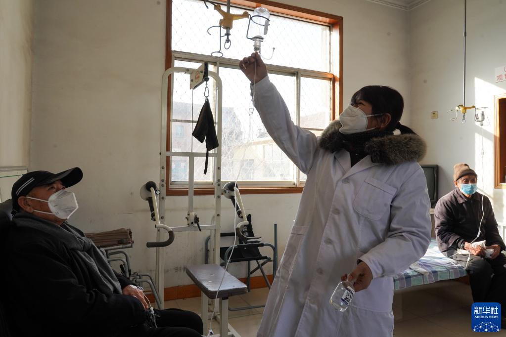 1月10日,山东省济南市长清区大崮山村卫生室全科医生王玉新为前来输液的村民换药。 为加强农村地区医疗健康服务,山东对农村地区老年人深入开展健康摸排,组建3.2万个家庭医生团队,同时利用医联体、医共体和城市医疗集团,县乡村三级医疗机构协同联动,保障农村群众用医用药。 新华社记者 朱峥 摄