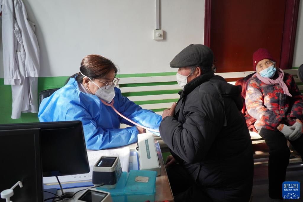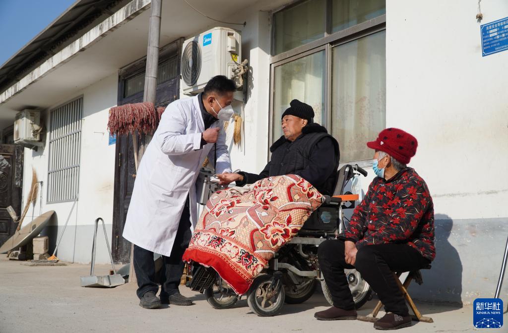 1月10日,在山东省郓城县郭屯镇邵集村,村卫生室的全科医生杨延秋上门为78岁老人杨印武检查身体。 为加强农村地区医疗健康服务,山东对农村地区老年人深入开展健康摸排,组建3.2万个家庭医生团队,同时利用医联体、医共体和城市医疗集团,县乡村三级医疗机构协同联动,保障农村群众用医用药。 新华社记者 徐速绘 摄