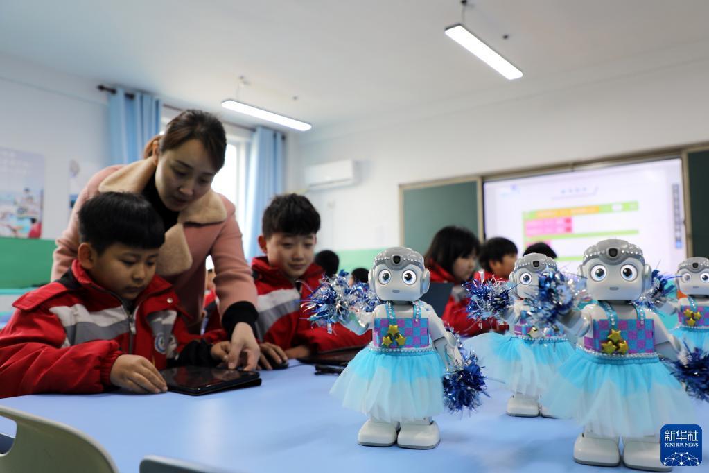1月10日,在石家庄市井陉县南秀林小学人工智能教室,井陉县北方学校的老师在指导学生设计机器人舞蹈动作。