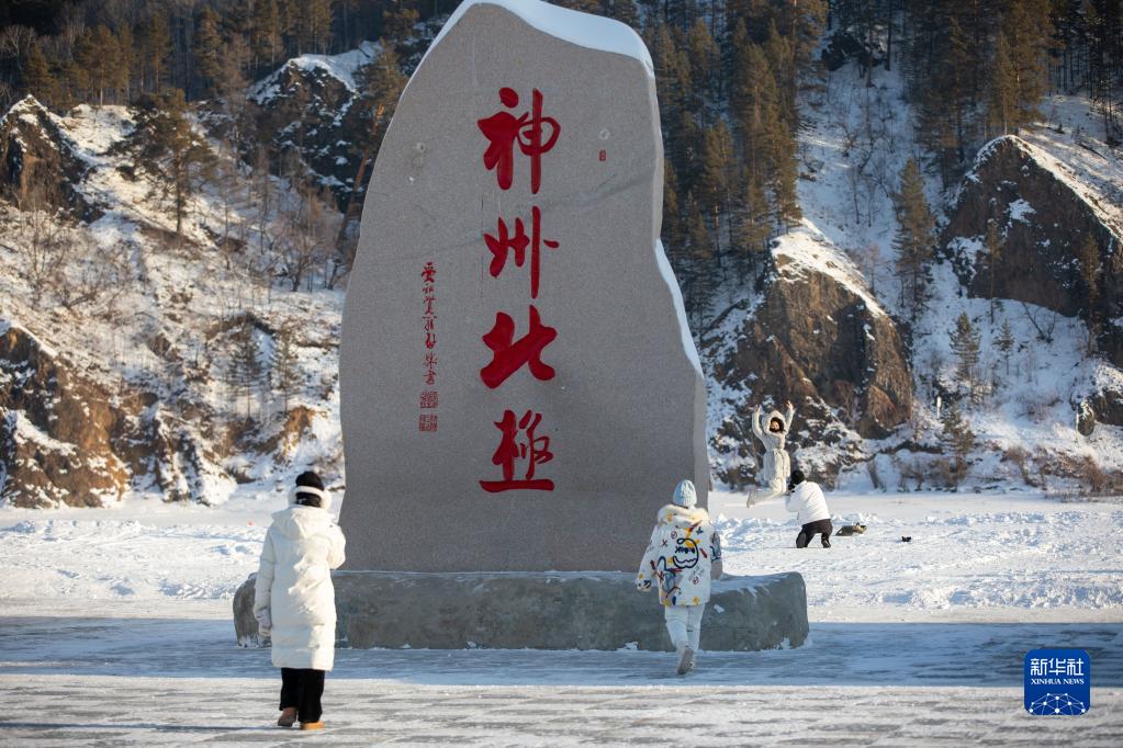 1月10日,在黑龙江省漠河市北极村神州北极广场,游客拍照留念。