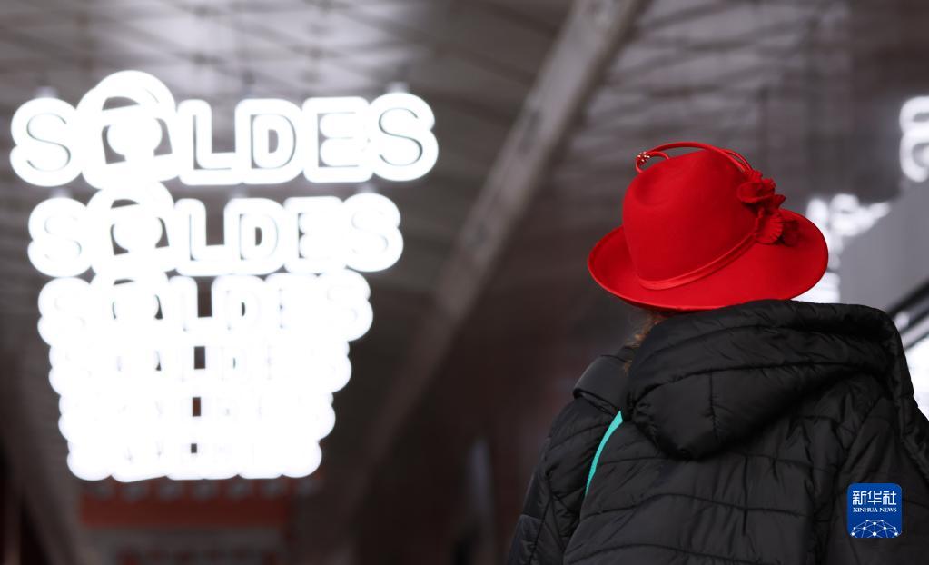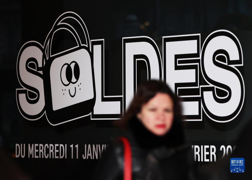 1月11日,一名女子走过法国巴黎街头的打折季广告。 当日,法国2023冬季打折季拉开帷幕。打折季将持续四周,至2月7日结束。 新华社记者 高静 摄