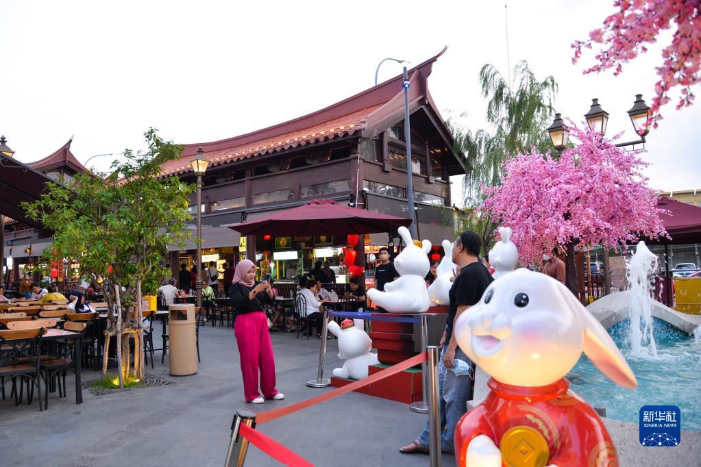 1月12日,游客在印度尼西亚雅加达潘佐兰广场游玩。 兔年春节临近,印度尼西亚雅加达潘佐兰广场(又名“新中国城”)内焕然一新,节日氛围渐浓。 新华社记者 徐钦 摄