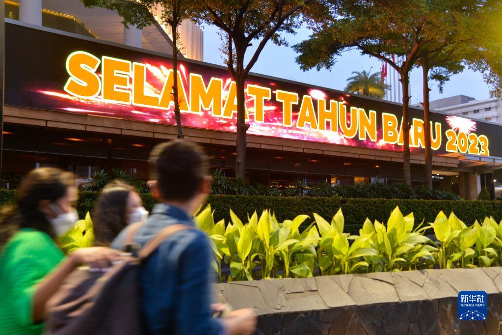 2023年1月1日,在印度尼西亚雅加达,人们经过一块显示着印尼语“2023新年快乐”字样的广告屏幕。 辞旧迎新之际,人们在世界各地迎接新的一年。 新华社记者 徐钦 摄