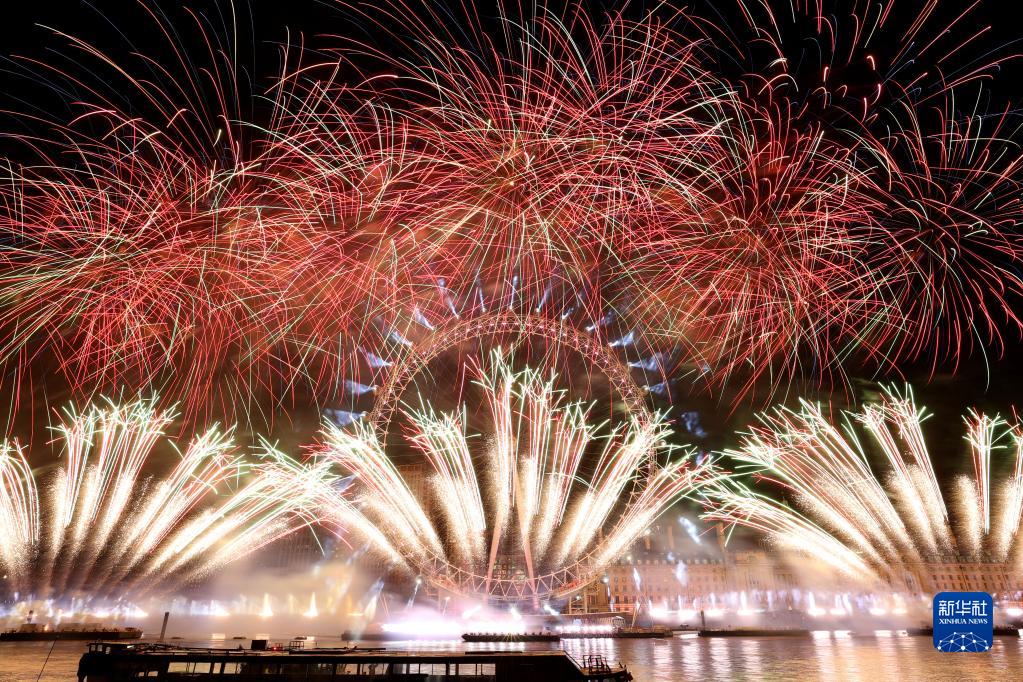 这是2023年1月1日在英国伦敦拍摄的新年烟花。 辞旧迎新之际,人们在世界各地迎接新的一年。 新华社记者 李颖 摄