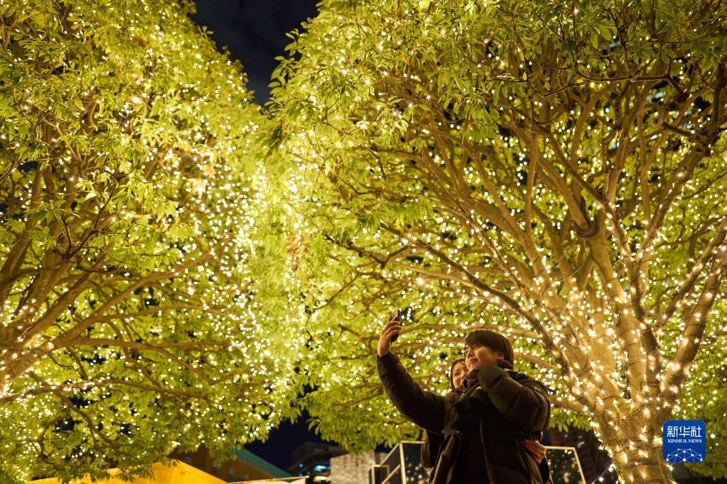 12月25日,游客在日本东京惠比寿花园点亮灯光的树下合影留念。年末将近,东京多地点亮灯光辞旧迎新。新华社记者 张笑宇 摄