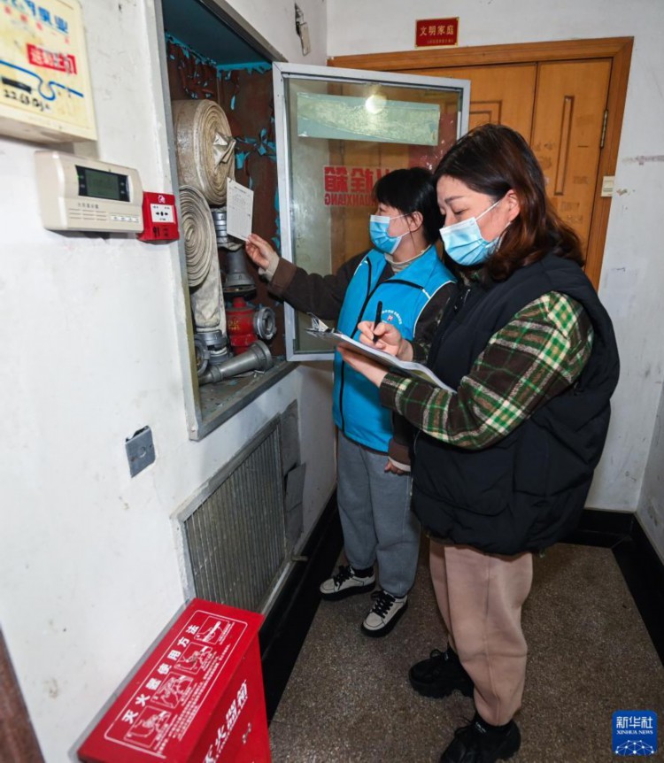1月12日,在飞英街道河畔居小区内,社区安全生产负责人联合网格员开展节前消防安全检查。