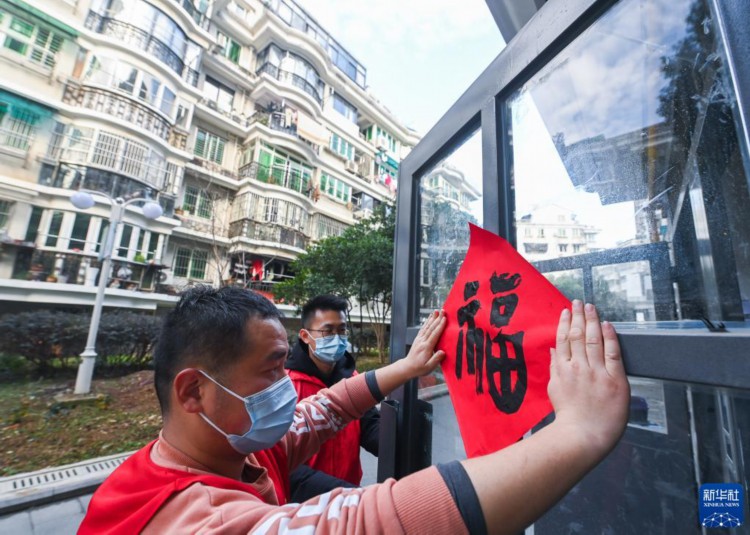 1月12日,在飞英街道竹翠园社区新世纪花苑小区,志愿者在小区楼道门上贴福字。 临近新春佳节,浙江省湖州市飞英街道各社区积极开展环境清扫、安全检查等工作,全面提升社区环境、营造节日氛围。近年来,湖州市飞英街道全力推进城镇精细化管理,从基础设施、生活环境、物业服务等方面推进“美丽小区”建设,全面提升社区环境。 新华社记者 徐昱 摄