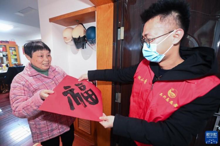 1月12日,在飞英街道竹翠园社区新世纪花苑小区,志愿者在为居民写福字。 临近新春佳节,浙江省湖州市飞英街道各社区积极开展环境清扫、安全检查等工作,全面提升社区环境、营造节日氛围。近年来,湖州市飞英街道全力推进城镇精细化管理,从基础设施、生活环境、物业服务等方面推进“美丽小区”建设,全面提升社区环境。 新华社记者 徐昱 摄