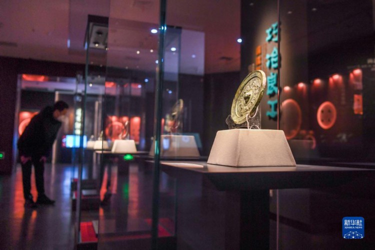 1月12日,观众在大云山汉王陵博物馆铜镜展区内参观。 当日,位于江苏省淮安市盱眙县的大云山汉王陵博物馆正式向公众开放,该馆建筑面积约1.2万平方米,展出文物一千余件(套),通过“朝、国、王、陵、城”的展览主线,多角度、全方位呈现大云山汉王陵遗址的考古发掘研究成果。 新华社记者 李博 摄