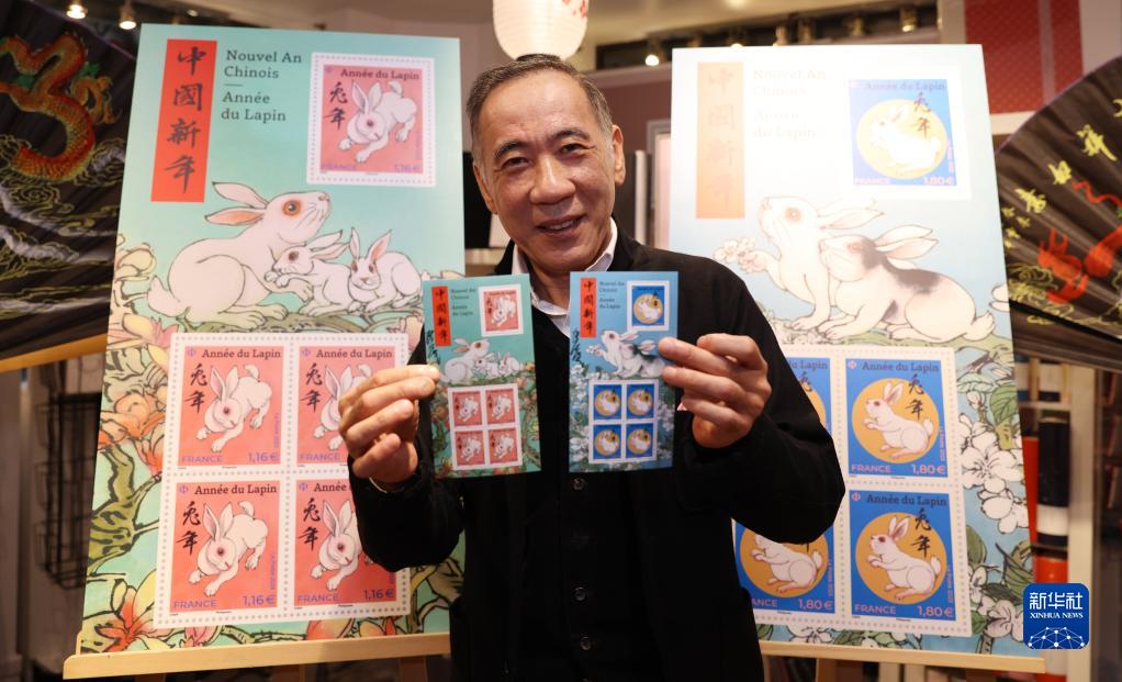 为迎接中国农历新年,法国邮政公司14日在巴黎举行中国兔年生肖纪念邮票发行仪式。中国兔年生肖纪念邮票共两款,由法国华人艺术家陈江洪设计。新华社记者 高静 摄