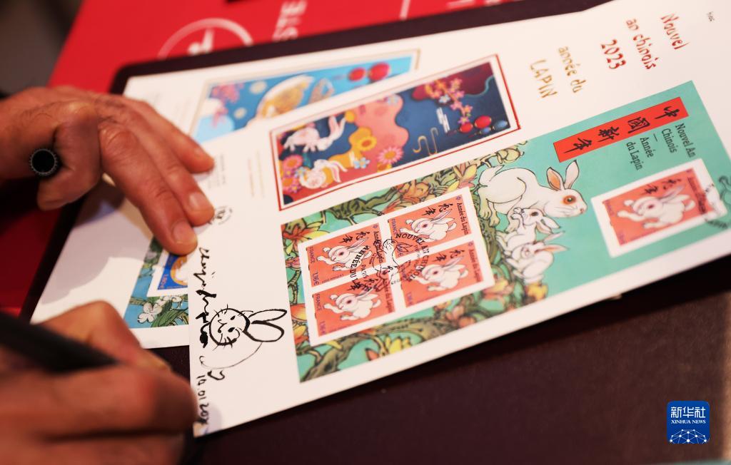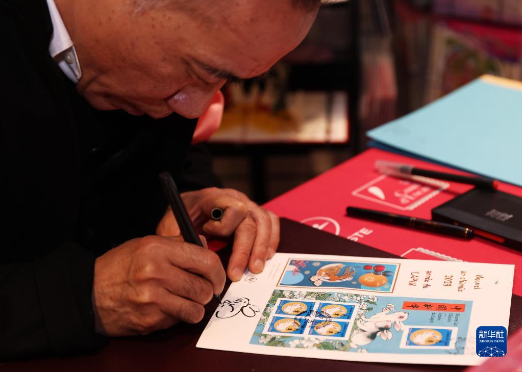 1月14日,在法国巴黎举行的兔年生肖邮票发行仪式上,邮票设计者陈江洪为集邮爱好者签售兔年生肖纪念邮票。 为迎接中国农历新年,法国邮政公司14日在巴黎举行中国兔年生肖纪念邮票发行仪式。中国兔年生肖纪念邮票共两款,由法国华人艺术家陈江洪设计。新华社记者 高静 摄