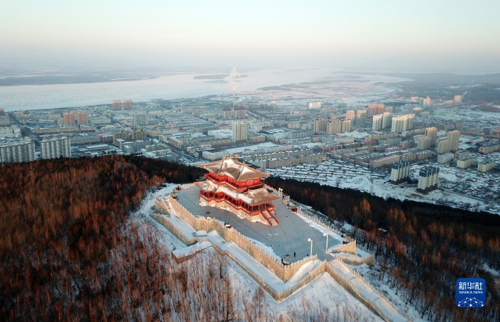 1月9日拍摄的抚远市城区景色和东极阁(无人机照片)。 新华社记者 王建威 摄