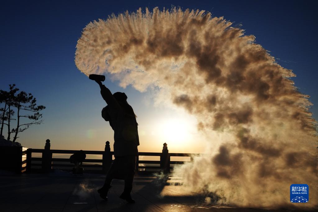1月14日,在抚远市东极阁,游客在日出时玩“泼水成烟”。 新华社记者 王建威 摄