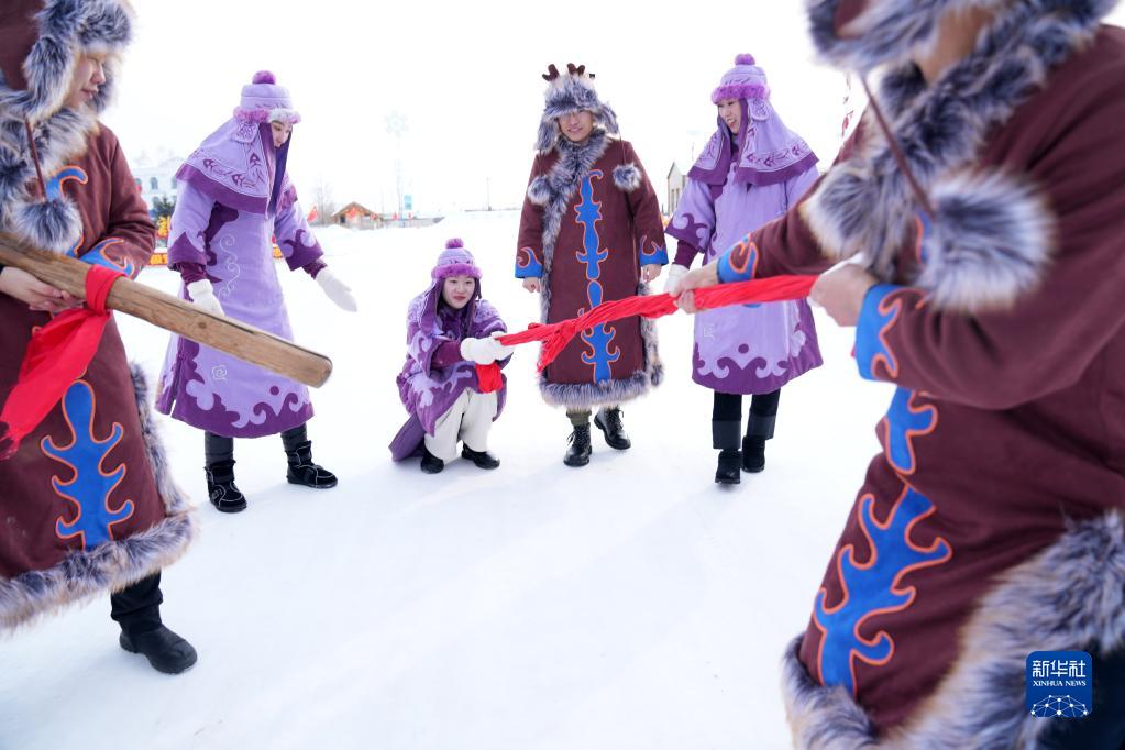 1月11日,在抚远市乌苏镇抓吉赫哲族村,赫哲族青年在雪地上娱乐。 新华社记者 王建威 摄