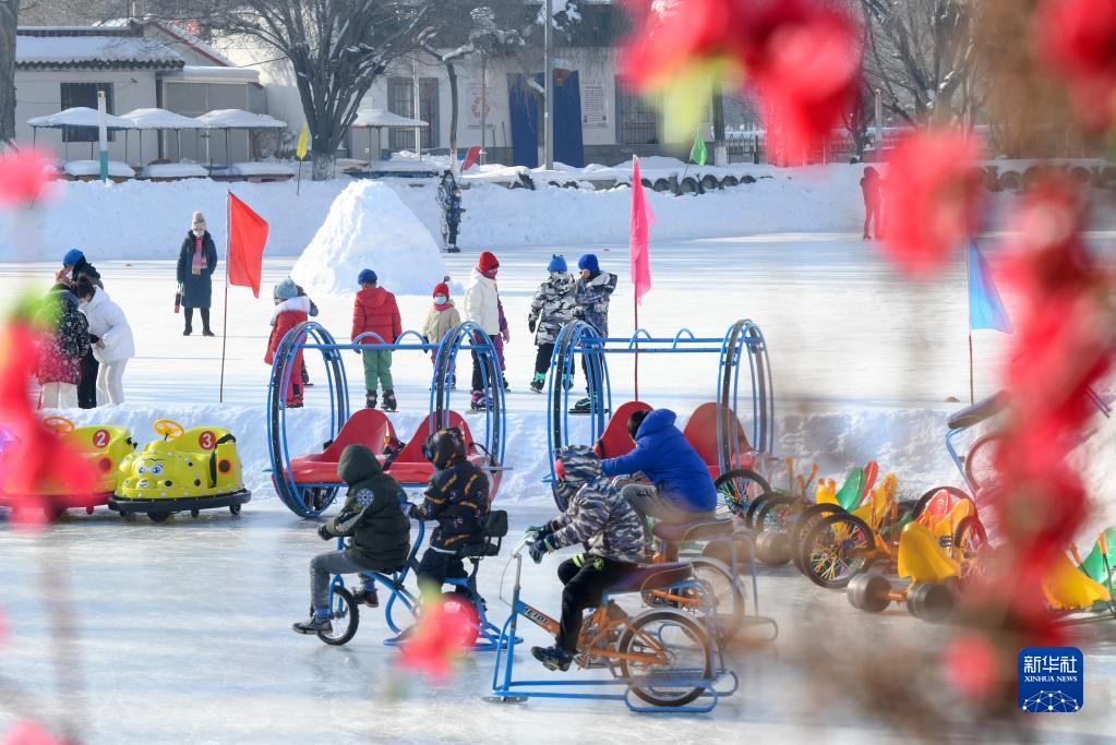 1月15日,小朋友们在乌鲁木齐红山公园冰场上玩耍。