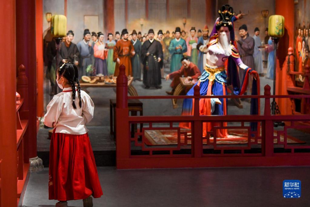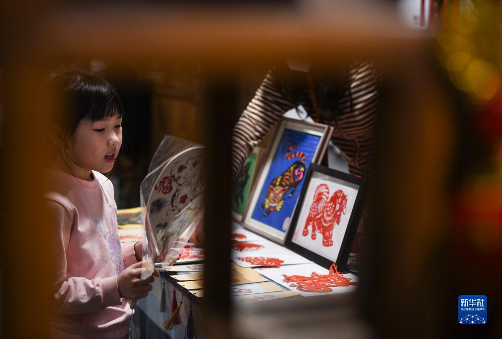 在乌鲁木齐市博物馆内,一名小朋友在参观展出的非遗项目剪纸作品(1月14日摄)。