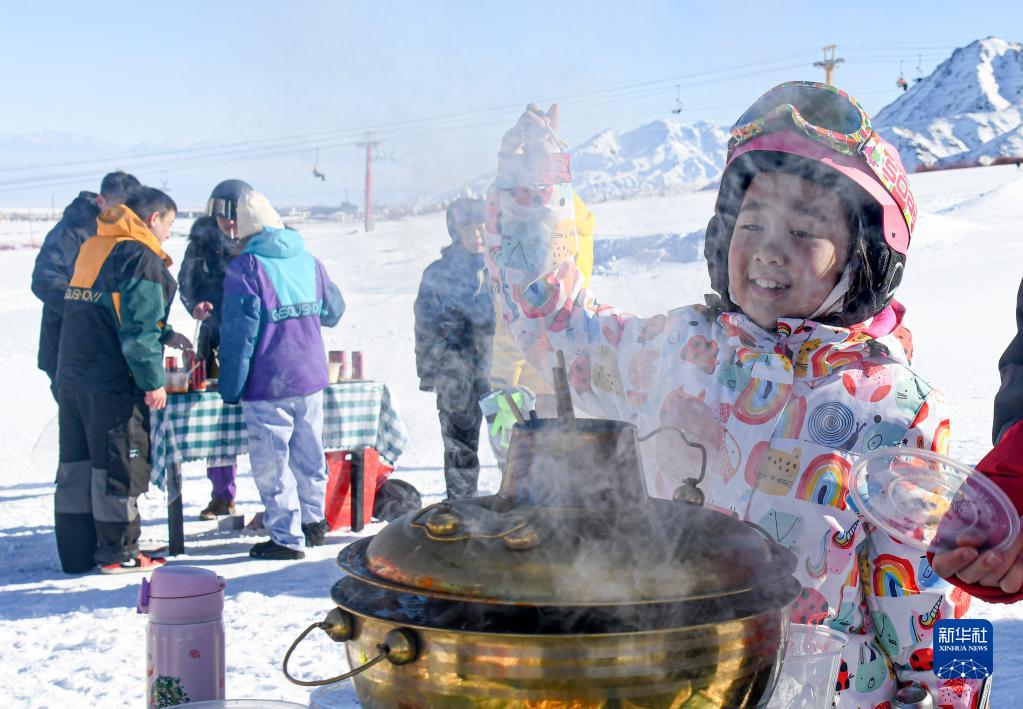 在新疆白云国际滑雪场上,一名小朋友在雪场举办的冰雪火锅节上等待品尝美食(1月13日摄)。