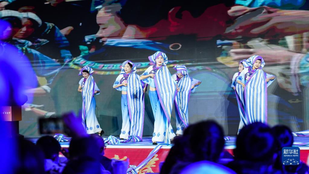 市民在贵阳市南明区兰花广场年货节现场观看文艺表演(1月14日摄)。