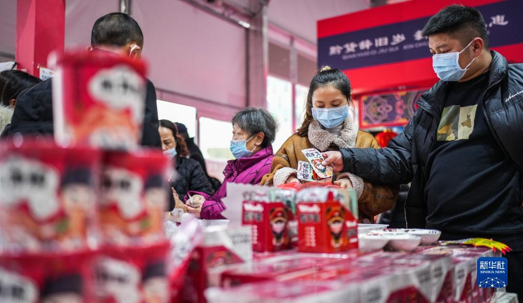 市民在贵阳市南明区兰花广场年货节现场选购商品(1月14日摄)。